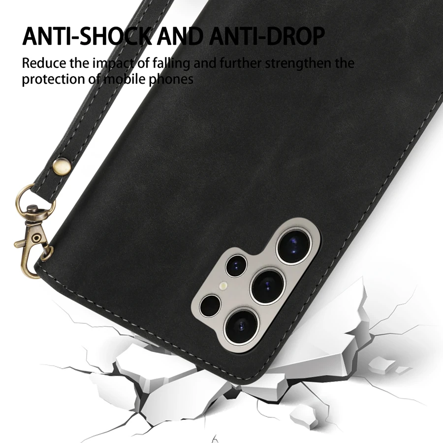 Protect your Samsung Galaxy S24, S23, and A-series with this premium PU leather wallet case. Soft TPU inner shell absorbs shocks and resists scratches, dust, and daily wear. Features a secure magnetic closure, built-in card slots, kickstand for hands-free viewing, and wrist strap for easy carrying. Available in black, wine red, blue, brown, and coffee.