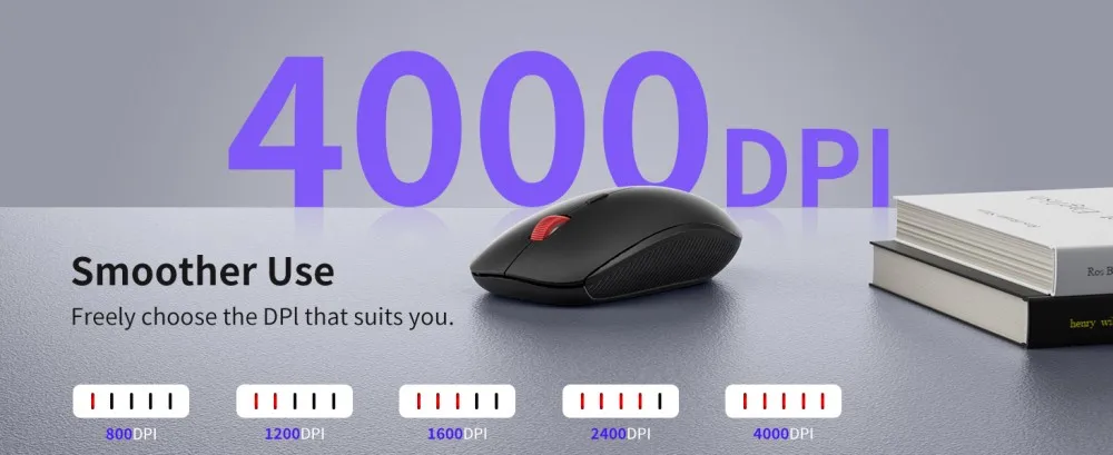 Our wireless optical mouse features 5 adjustable DPI levels (800/1200/1600/2400/4000), giving you precise performance and smart cursor control across various surfaces. Now, customize it to fit your workflow